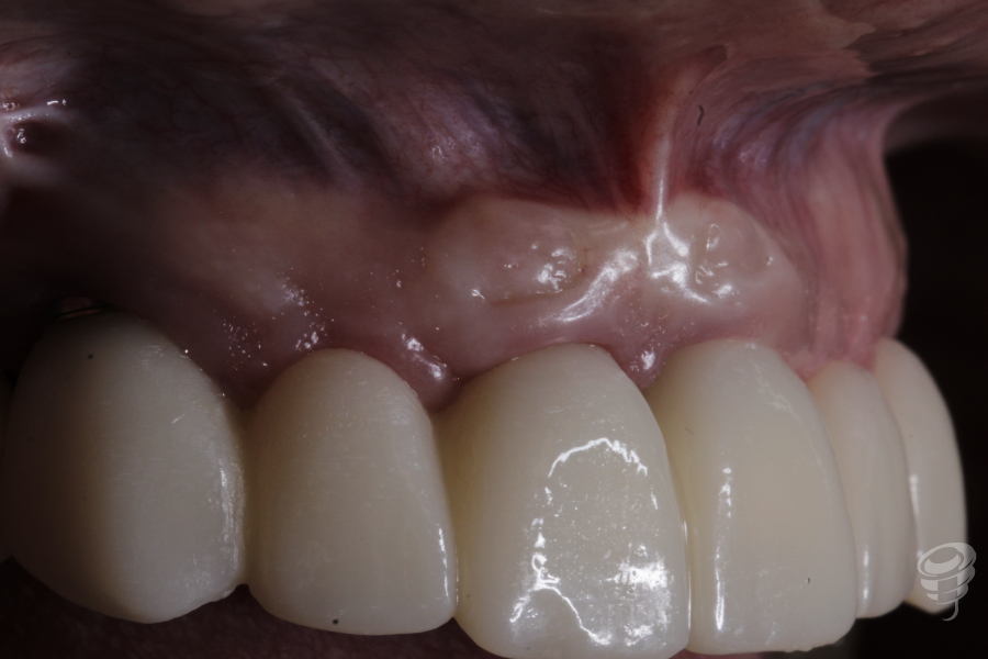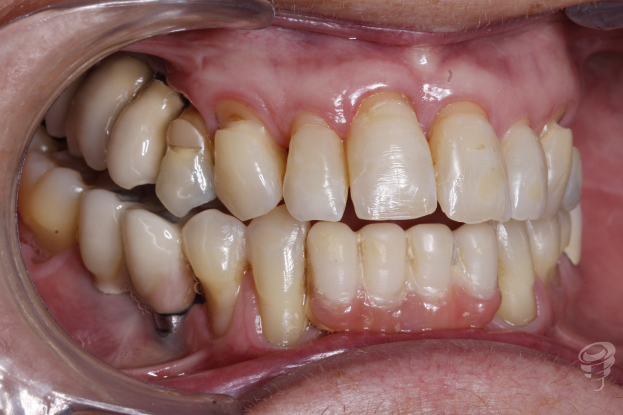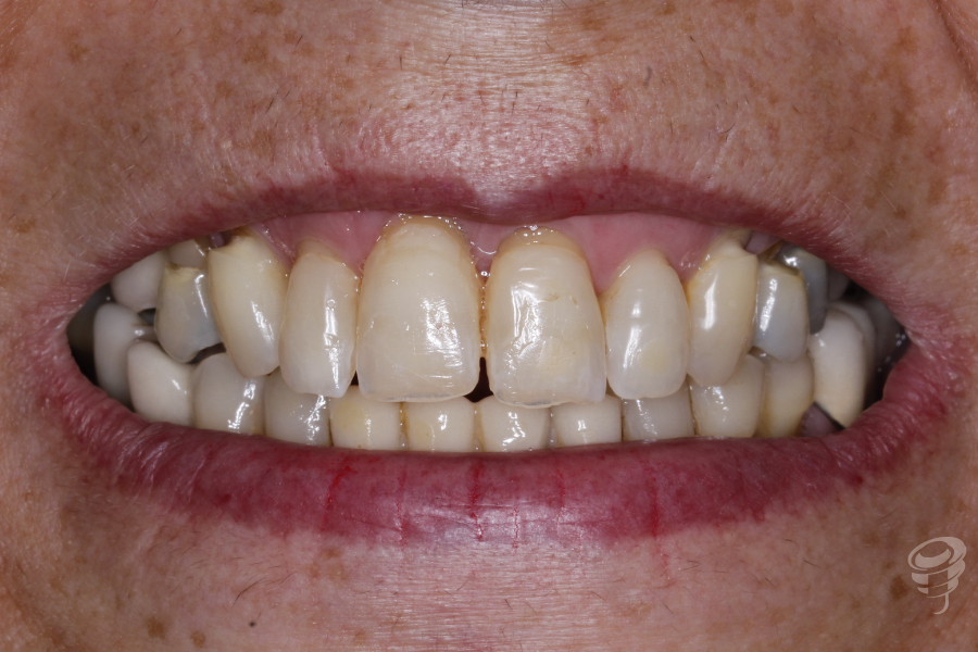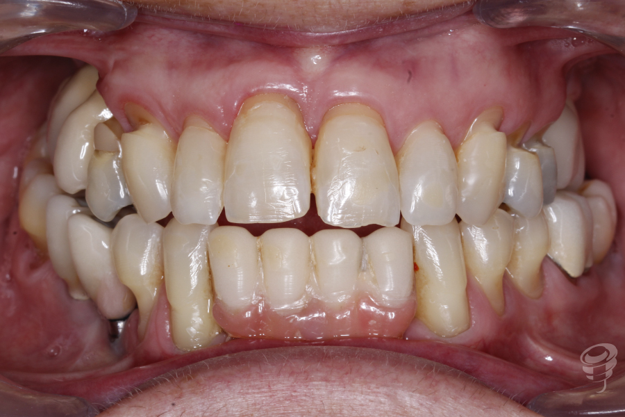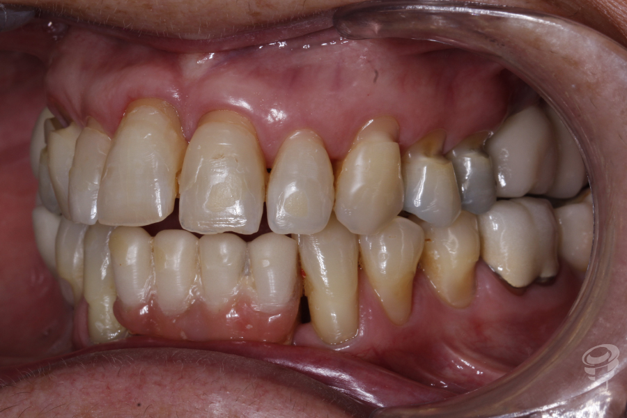 Podemos notar la pérdida de soporte periodontal que hay en el 11 y 21 y una descompensación asimétrica de los márgenes gingivales. Además, mordida abierta anterior y posterior derecha, mordida cruzada posterior bilateral, guías caninas ausentes. Un precario ajuste oclusal y bruxista. Podemos observar notables signos de abfracción en los cuellos 14, 13, 23, 24 y 25.