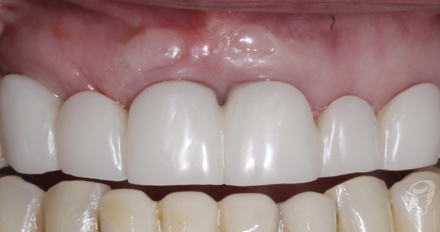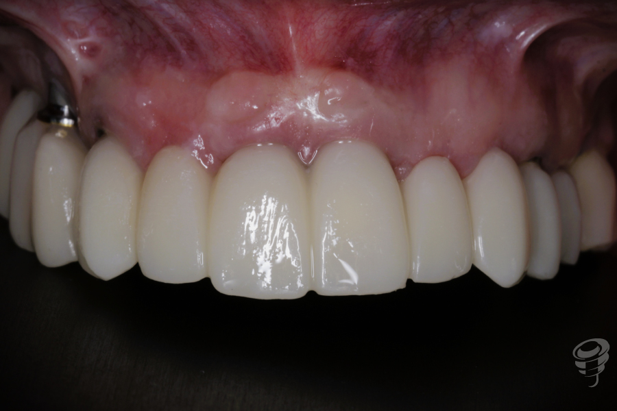 Resultado de los perfiles de emergencia, situación estética gingival y protética de un PMMA que será el paso justamente anterior a la prótesis definitiva que se realizará en Zirconio monolítico.