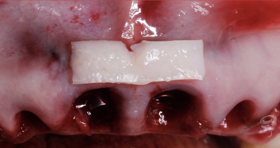 Realizamos extracción de las piezas afectadas periodontalmente. Colocamos los implantes en posiciones, 14, 13, 11, 21 y 23. Simultáneamente un injerto de tejido queratinizado desepitelizado, en zona 11 y 21, para ganar volumen.