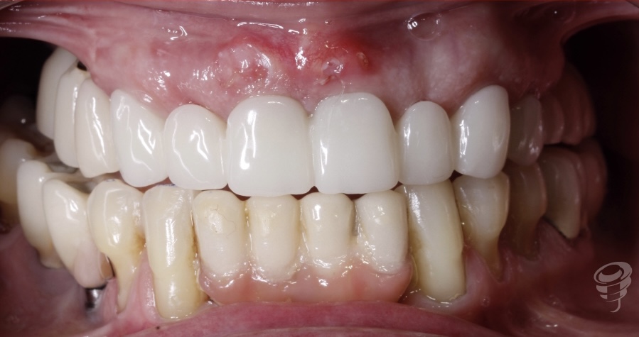 Paciente presenta periodontitis crónica severa generalizada en piezas desde 14 hasta 25. Con limitación estructural ósea importante por lo que decidimos realizar carga inmediata FP1 más el llenado de los gaps alveolares. Además de regeneración tisular en premaxilar.