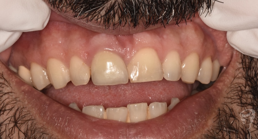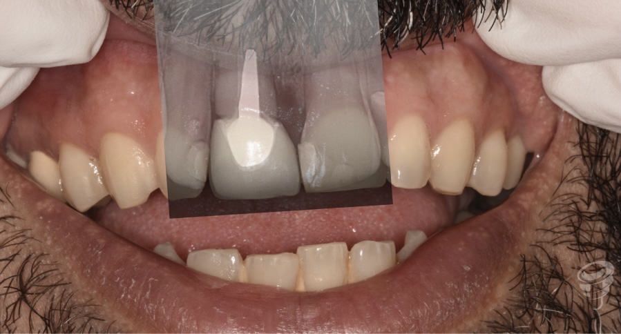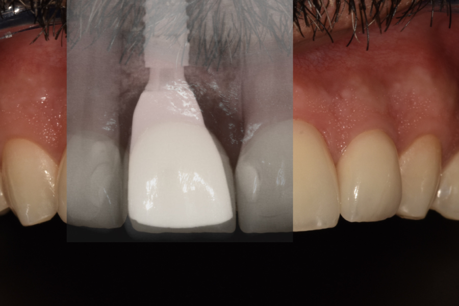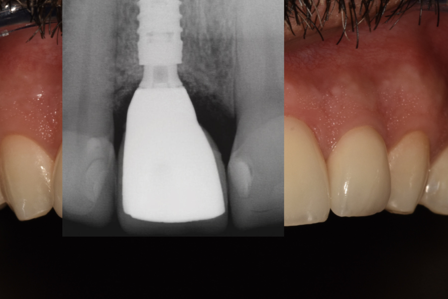 • Caso clínico: Paciente masculino de 45 años con fractura irreparable del incisivo central superior derecho (11) previamente tratado con una endodoncia y unión colado, fracturado por trauma oclusal. Se realizó extracción atraumática, colocación de implante inmediato, injerto óseo xenogénico mezclado con hueso antólogo del fresado, e injerto de tejido conectivo subepitelial para optimizar el perfil de emergencia. A los 4 meses se colocó corona implanto-soportada de zirconio y carillas de disilicato de litio en dientes 12 y 21.